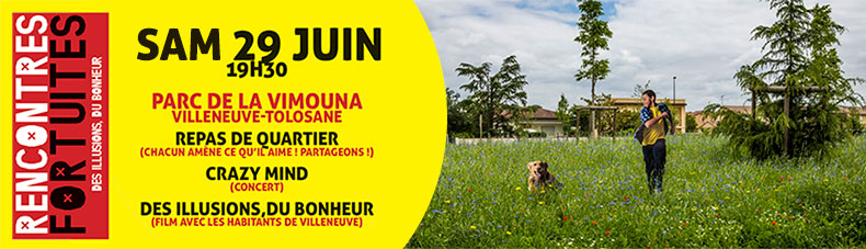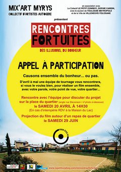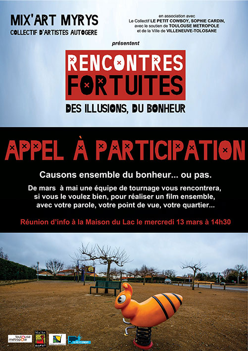 Depuis 4 ans, Mix’Art Myrys propose sur le territoire de la Communauté Urbaine du Grand Toulouse ses Rencontres Fortuites, une tentative d’appréhender autrement la relation artistes-œuvre-population-territoire. Cette année, Mix’Art Myrys s’est approprié la question du bonheur entre illusion, rêve ou réalité. Ce projet artistique, associant étroitement des habitants autour de témoignages, de ce que certains nomment désormais les écritures du réel, s’est développé sur les villes de Blagnac, Fenouillet, et viendra investir la ville de Ramonville en amont et pendant le festival. Il donne lieu alors à une installation plastique, à la projection d’un film, du débat, des rencontres, du temps enfin à prendre, à reprendre.