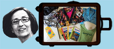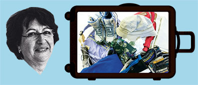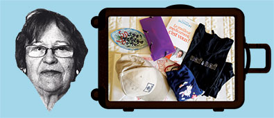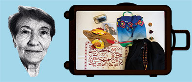 Une poule extraite de ma collection, un sac à dos de montagne, un bijou de Bethmale, une bague en plastique achetée rue Saint-Rome, un point de croix créé en 2002.